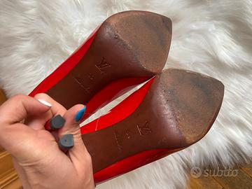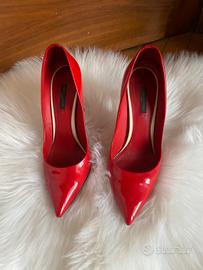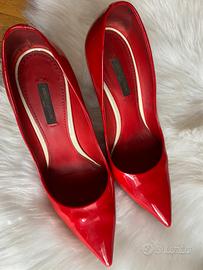 Tacchi alti, décolleté a punta in vernice rossa con dettagli in ottone dorato. Originali scarpe da donna marca Louis Vuitton