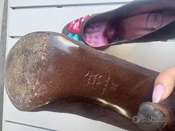 Décolleté con tacco di Just Cavalli Marroni scamosciate con ricami floreali colorati. Tacco a spillo 10 cm Numero 36 Usate ma in buone condizioni