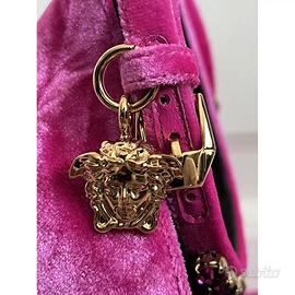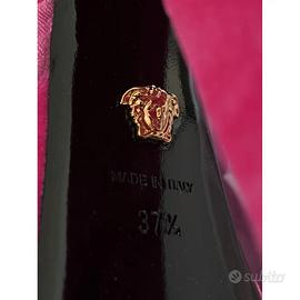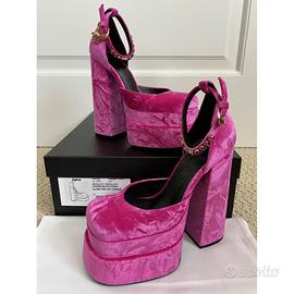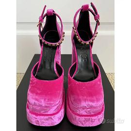 Le scarpe sono le classiche décolleté con plateau "Medusa Aevitas" con punta quadrata in rosa "fucsia" velluto schiacciato strutturato. Hanno cristalli rosa sui cinturini regolabili alla caviglia. Hanno l'iconico ciondolo con logo della testa di Medusa su un cinturino alla caviglia in hardware color oro. Hanno tacchi grossi da 6 1/4" e doppie piattaforme da 2 1/2". Vendita al dettaglio $ 1575.