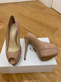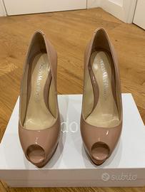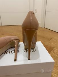 Décolleté spuntate Nando Muzi originale, in vernice color nudo tg 37,5. Nuove con etichetta, mai calzate.Tacco 14 cm, plateau 3 cm. Complete di scatola originale, shoebag e sacchetto con sotto tacchi di ricambio.