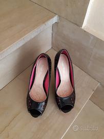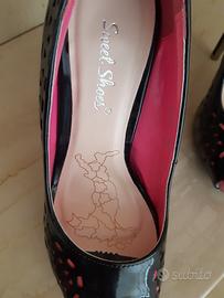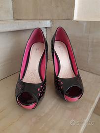 Décolleté nere lucido con tacco a spillo di 13 cm e plateau di 3 cm. Elegante decoro laterale realizzato con excisioni che mostrano il sottostante colore fuxia. Scarpa n. 38. Nuove, mai indossate.