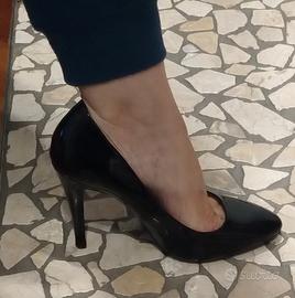 Vendo decollete nere in vernice, di Zara, indossate una sola volta (tacco troppo alto per me), con punta lievemente arrotondata, tacco sottile alto 12 cm, mis.40, tacchi di scorta inclusi. Prezzo 29 eu.