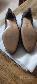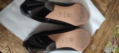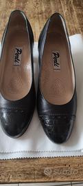 Décolleté nere Perli realizzate in vera pelle nera , con punta leggermente strutturata (effetto coccodrillo)con tacco 40 a rocchetto e suola in cuoio. Sono in taglia 35 come inciso sulla suola,prodotte in Italia (made in Italy).