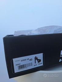 Décolleté Primadonna nere lucide, nr. 40, con plateau 5 cm e tacco 15 cm. Chiusura con cinturino alla caviglia.
