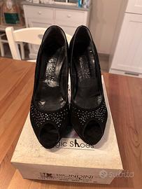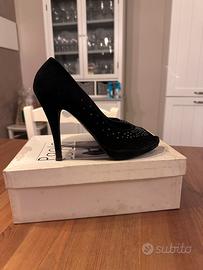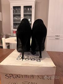 Eleganti décolleté nere con tacco alto e plateau, presentano una tomaia in camoscio decorata con strass applicati sulla parte anteriore e lungo il lato della scarpa. Modello: Décolleté spuntate (open-toe) con tacco a spillo e plateau. Materiale: Camoscio nero con rivestimento interno in pelle costo nuove: 139€