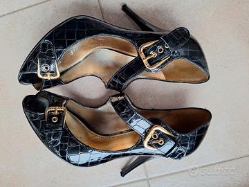 Elegantissimo décolleté con punta aperta, tacco 11, taglia 40. Colore nero vernice lucida, lavorazione coccodrillo. Interno pelle dorata e fibbie dorate con elastico e 3 fori per adattare la larghezza. Usate una sola serata, praticamente nuove. Non presentano alcun difetto o screpolature. Disponibile a inviare ulteriori foto e informazioni.