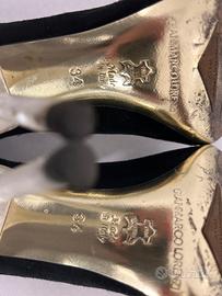 Décolleté nero scamosciato con bordatura color oro e tacco in simil madreperla, tacchetti di ricambio Gianmarco Lorenzi.