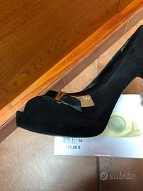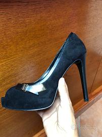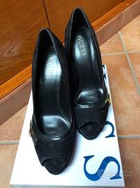 Décolleté nero spuntato donna originale GUESS. Materiale: suede, fondo: platò con fiocco elegantissimo laterale. Tacco alto 12 cm che slancia la figura e conferisce femminilità al piede. Numero 39, molto comode!