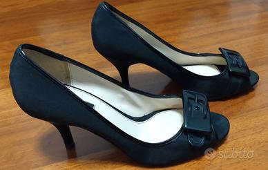 Vendo decollete oper toe di Zara indossate solo un paio di volte, in tessuto cannetté nero con profili in vernice, fibbia in bachelite tipo cintura sulla fascia, tacco sottile alto cm 6.5, mis. 40. Pagate 45 eu le vendo a 25 perchè su un tacco c'è un piccolo graffio non visibile una volta indossate.