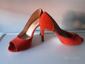 vendo décolleté open toe marca ONAKO' made in Italy in vera pelle color corallo numero 36 scamosciate aperte lateralmente tacco 9 cm usate pochissimo pari al nuovo