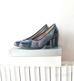 Décolleté stile fairy in vera pelle blu ed azzurro satinato con punta e tallone in vernice e strass integri sul davanti.