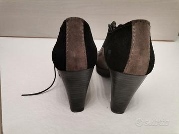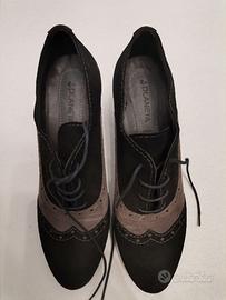 Scarpe con tacco largo e punta chiusa marca PLANETA, in vera pelle scamosciata. Colore nero e tortora, con raffinata lavorazione traforata in stile inglese. Tacco stabile, comode ma eleganti, perfette per l’ufficio o occasioni formali.