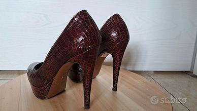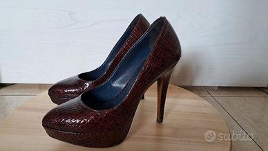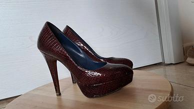 Decolletè POLLINI in vero cuoio color bordeaux scuro. Taglia 35. Utilizzate forse in una decina di occasioni. Tacco 12 cm. Plateau 2 cm