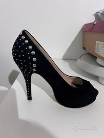 Décolleté primadonna nere con borchie, plateau 2,5 e tacco 12.