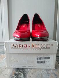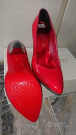 Scarpe eleganti da cerimonia, decollete laccato (vernice rossa) con tacco e plateau argentato.