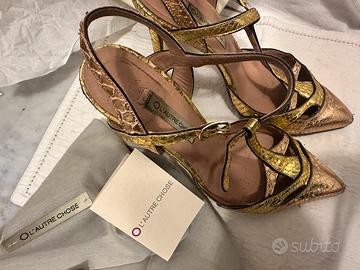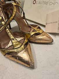 Décolleté marchio L’Autre Chose, in pelle oro e rosa, taglia 40, tacco 11cm ma comode, buono stato con una punta di pelle leggermente consumata. Sempre belle e da effetto.