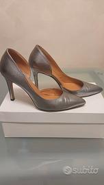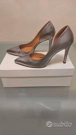 décolleté semiaperto in pelle color platino. tacco 9 cm taglia 37.5