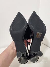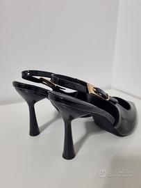 Vendo décolleté slingback nere in vernice, con tacco medio a rocchetto e punta affusolata.