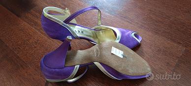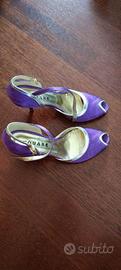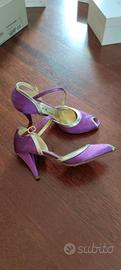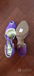 Bellissime ed eleganti décolleté in raso, di colore viola brillante con profili in argento, nuove, MAI indossate, numero 37, tacco 5 cm.