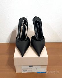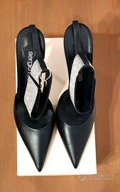 decolleté, pelle, tinta unita con applicazioni, cristalli, interno in pelle, chiusura con velcro, punta stretta, tacco geometrico, suola in cuoio,