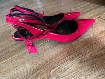 Decollete in vernice rosso magenta/fuxia, tacco 7cm, laccetto doppio giro alla caviglia con dettaglio lucchetto. Taglia 37