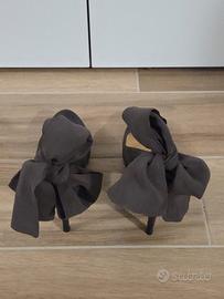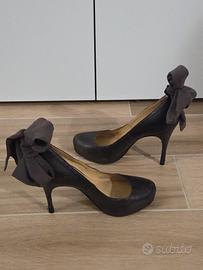 Scarpe Twinset originali in pelle con dettaglio maxi fiocco in tessuto sul tallone. Modello con tacco a spillo e plateau interno. Presentano segni di usura visibili: spellature sui tacchi, punte segnate e segni d'uso sulla tomaia e all'interno come mostrato in foto. Vendute senza scatola originale.