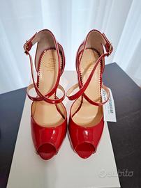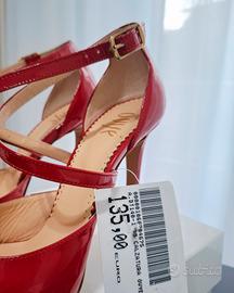 Bellissima décolleté spuntata in vernice rossa con tacco 12 e cinturino incrociato. Nuova con cartellino. Made in Italy. Marca: Ovyé.