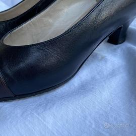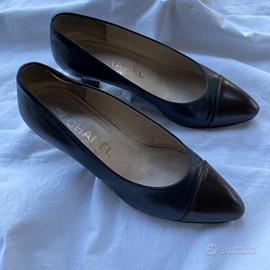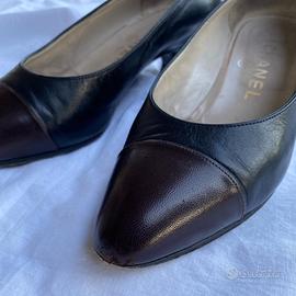 Décolleté vintage Chanel nere con punta color testa di moro. Numero 35,5. Condizioni buone. Risultano solo alcune imperfezioni sui tacchi, nella parte inferiore e leggermente sulle punte. In più, come visibile in foto, la parte interna della scarpa destra a livello del tallone è un po' scollato, ma una volta indossate non è minimamente percettibile. A mio parere, queste piccole imperfezioni non pregiudicano in alcun modo la loro bellezza. Dispongono ancora della loro scatola originale, su cui è presente la scritta con il numero 36,5 nonostante le scarpe siano un 35,5. (Non saprei il perché).