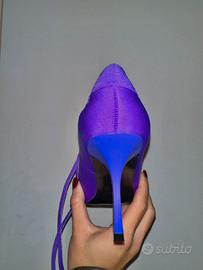 Décolleté viola in tessuto con nastri alla schiava. mai usate, ancora con la pellicola sulle suole. senza scatola originale.