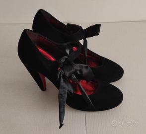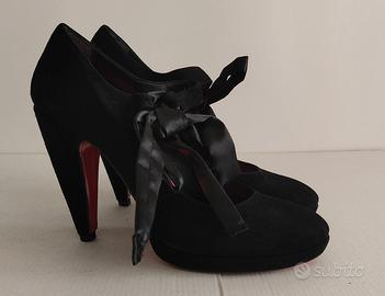 Indossato poche volte con qualche piccola usura del camoscio in alcuni punti, pianta non larga, con tacco 100 + plateau ( cm 1,5 ), sottopiede metallizzato rosso e suola rossa. Elegante e comodo cinturino in camoscio nero + laccetto in raso nero.