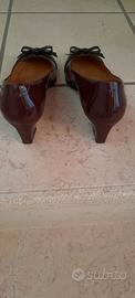 Vendo eleganti decoltè in vernice color vinaccia con fiocco nero n. 36. Indossate solo un paio volte, praticamente nuove, ottima occasione per scarpe artigianali di qualità. Vendo per errata taglia. Scambio a mano o spedizione a carico acquirente