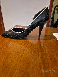 Vendo bellissime decoltee blu a pois celesti con bordino ricamato bianco. Acquistate nel 1985 e indossate una sola volta, sono in perfetto stato. n.39