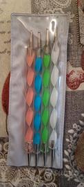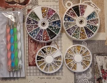 Vendo strass vari colori e varie forme di decorazione ( cuoricini, stelline, gocce, etc) con punteggiatori di varia misura del punto per decorare le unghie.
