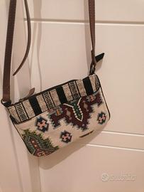 Deliziosa e pratica borsetta in cotone con texture colorata e tracolla in pelle (ci sono più fori, quindi allungabile).