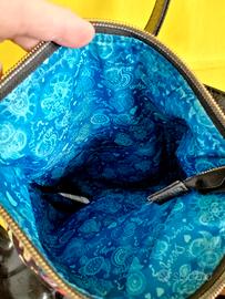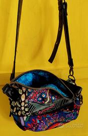In condizioni perfette, usata mezza volta e poi conservata, questa borsa a tracolla in tessuto e pelle, brand Desigual. Oltre alla tracolla regolabile, ha anche quella piccola e più corta. Interno rivestito di un brillante tessuto color turchese.