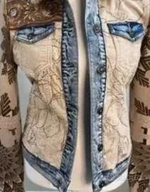 Desigual Giacca New Eloise decorata multicolore, inserti jeans, collo pelliccia, Taglia 38. Come nuova