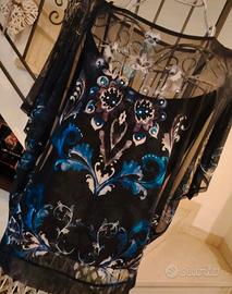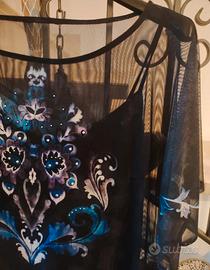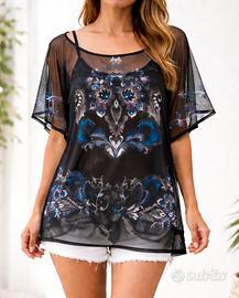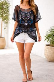 Maglietta originale Desigual composta da doppio strato: canotta nera con spalline sottili e sopra t-shirt completamente trasparente con bellissima stampa decorativa sui toni del blu/viola e applicazioni di strass. Vestibilità morbida, leggera e molto particolare, perfetta sia per look casual con shorts o jeans, sia per outfit più curati.
