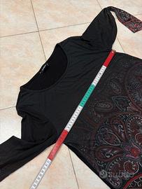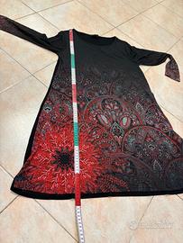 Abito nero grigio e rosso con fantasia paisley nel fondo. DESIGUAL a manica lunga, ideale per la mezza stagione. Taglia L, le misure in cm sono riportate in foto. 95% viscosa 5% elastico. Condizioni ottime. Contattatemi per ulteriori informazioni.
