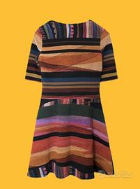 Questo vestito è un vero capolavoro di colori e geometrie classico stile Desigual, unisce comfort e struttura grazie al suo tessuto elasticizzato e alla texture dinamica delle righe, perfetto per chi ama distinguersi con capi artistici e originali senza rinunciare allo stile