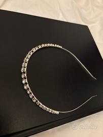 Splendido diadema sottile in metallo argentato, decorato con una fila di cristalli trasparenti dal taglio brillante.