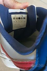 Vendo scarpe Diadora Raptor Low SL, in ottime condizioni, usate pochissimo, vendo per cambio numero. Sono in pelle e camoscio e presentano una combinazione di colori blu, rosso e bianco.
