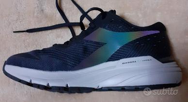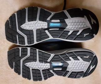 Scarpe Diadora modello Mythos Hip 6. Misura 36,5. Suola Ortholite "blu shield" (tutta in gel per un'ottima ammortizzazione), pianta comoda, tomaia traspirante; 2 passanti per i lacci impediscono lo spostamento della linguetta.