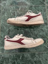 Sneakers Diadora bianche con dettagli rosso bordeaux, modello classico e intramontabile.