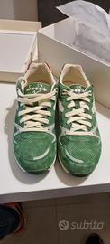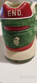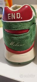 END. X DIADORA V7000 "STRAMILANO"CELADON GREEN Anche questa stagione END. unisce le forze con Diadora, celebrando la cultura italiana e onorando l'ultimo flagship store di Milano di END con una collezione di due pezzi. La sneaker V7000 mantiene il suo DNA originale. È realizzata in Italia con tomaie in pelle scamosciata, questa volta con un richiamo alla famosa bandiera tricolore italiana, con verde, rosso e crema. Il ricamo del logo END e la scritta "Milano" su un tallone, con lo storico simbolo del biscione sull'altro, sottolineano il look collaborativo.