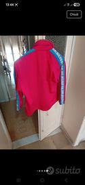 Questa giacca vintage rosa con dettagli celesti è un capo sportivo del marchio Diadora, come indicato dall'etichetta visibile sul colletto.