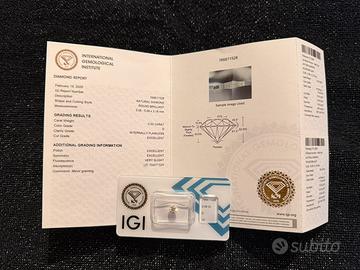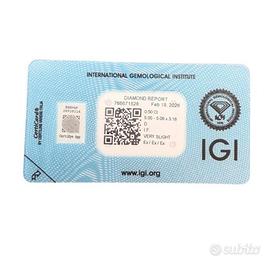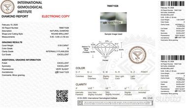 Diamante naturale certificato IGI con caratteristiche di livello superiore. Un magnifico Diamante taglio brillante rotondo da 0.50 carati che mostra la massima gradazione di colore. Con grado di taglio eccellente, emana una brillantezza e uno scintillio straordinari, massimizzando la resa della luce ad ogni angolazione. Certificato IGI, una delle migliori certificazioni a livello internazionale. Questo diamante è una scelta raffinata per un anello elegante o per una creazione di gioielli su misura Caratteristiche: • Peso: 0.50 carati • Colore: D (grado più alto – completamente incolore) • Purezza: IF (Internally Flawless – rarissimo) • Taglio: Excellent Parliamo di una combinazione D + IF, tra le più alte disponibili sul mercato. Questo significa: • massima purezza • assenza di imperfezioni interne • luminosità superiore Diamante adatto a chi cerca un prodotto di fascia alta, difficile da reperire con queste caratteristiche. ✔ Certificato IGI ✔ Numero inciso sul diamante ✔ Selezionato e verificato Numero di certificato: IGI 766671528 SKU: 0204-8 Possibilità di visionarlo dal vivo a PESCARA e scambio a mano con bonifico istantaneo.