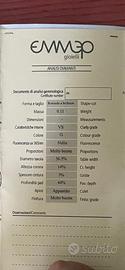 Forma e taglio - Rotondo a brillante Massa -0.11 Dimensioni - Caratteristiche interne -VS1 Colore G - Bianco extra Fluorescenza uv 365mm -Nulla Proporzioni - Molto buone Diametro tavola - 56.5% Altezza corona - 14% Spessore cintura - 3% Profondità pad - 44% Apice -Appuntito Finitura - Molto buona
