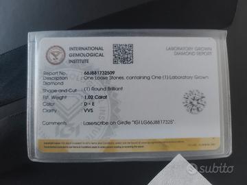 In vendita splendido diamante (CVD) da 1.02 carati, chimicamente e otticamente identico a un diamante naturale, ma più etico e sostenibile.