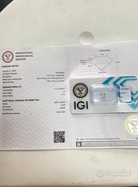 DIAMANTE NATURALE 0.44ct Colore E - Certificato IGI - SIGILLATO Vendo splendido diamante naturale con certificazione internazionale IGI (International Gemological Institute), ente tra i più prestigiosi al mondo. La pietra è SIGILLATA nel suo blister originale, garanzia assoluta di autenticità e integrità (mai montata su gioielli). DETTAGLI TECNICI (da Rapporto IGI 760520863): Tipo: Diamante Naturale (NON sintetico/lab-grown) Caratura: 0.44 carati Colore: E (Bianco eccezionale, tra i gradi più alti della scala) Taglio: Princess / Rettangolare Purezza: SI2 (Inclusioni naturali "Eye Clean", non visibili a occhio nudo) Fluorescenza: Nulla (Massima limpidezza della pietra) Simmetria/Lucidatura: Fair / Very Good PERCHÉ ACQUISTARLO: Il colore "E" è rarissimo nei gioielli commerciali (solitamente si fermano al G o H) e rende la pietra straordinariamente luminosa e bianca. Essendo già certificata e sigillata, è perfetta come: Investimento: Valore stabile nel tempo per un diamante naturale. Regalo unico: Pronta per essere incastonata in un anello di fidanzamento o un punto luce di alta gamma. PREZZO: € 500 (Leggermente trattabile per chiusura rapida) Disponibile per consegna a mano presso vostro gioielliere di fiducia in provincia di RAGUSA o spedizione assicurata tramite TuttoSubito. Massima serietà, no perditempo.