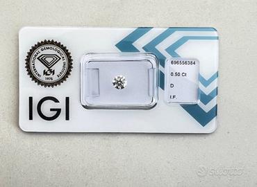 Dimante naturale 0,50 ct, purissimo, sigillato e certificato IGI il 29 aprile 2025, colore D (grado di colore massimo), purezza IF (massimo grado di purezza) 3 x EX (massimo grado di taglio e finitura), provenienza paesi bassi.